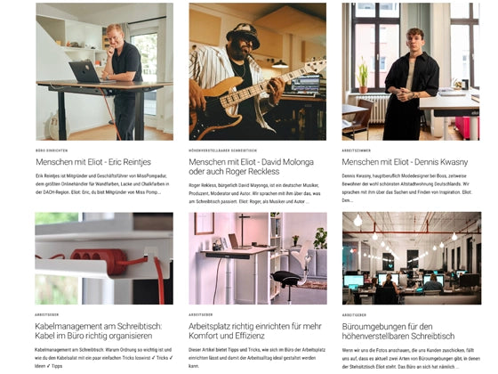Eliot, der höhenverstellbare Schreibtisch, ist in verschiedenen Designs erhältlich. Er lässt sich auf eine individuelle Tischhöhe zwischen 65 und bis zu 130 Zentimeter variabel einstellen. Der Tisch ist somit für jede Körpergröße geeignet und für ein Desk Sharing-Konzept im Unternehmen oder auch als Kinderschreibtisch ideal einsetzbar.