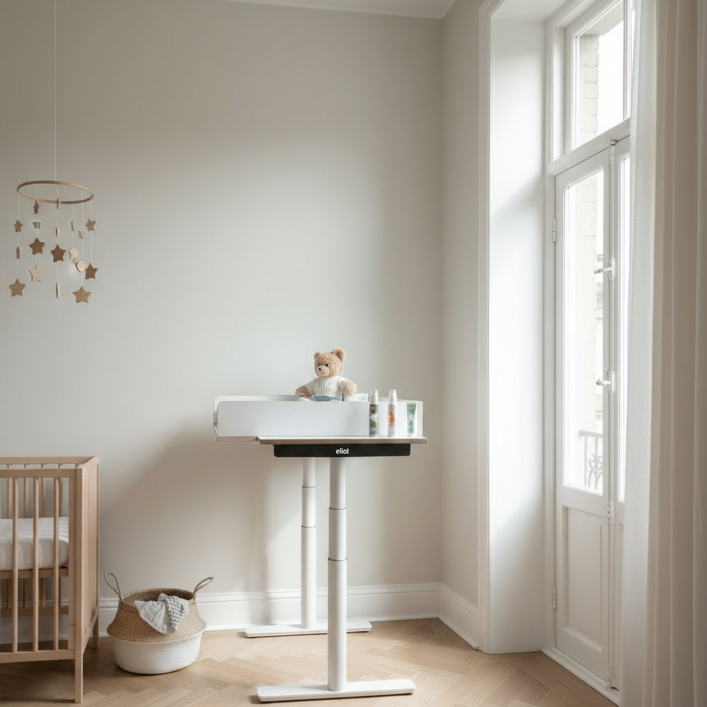 Der höhenverstellbare Wickeltisch basiert auf der bewährten Eliot Tiny Plattform– elektrisch verstellbar, stabil und leise.