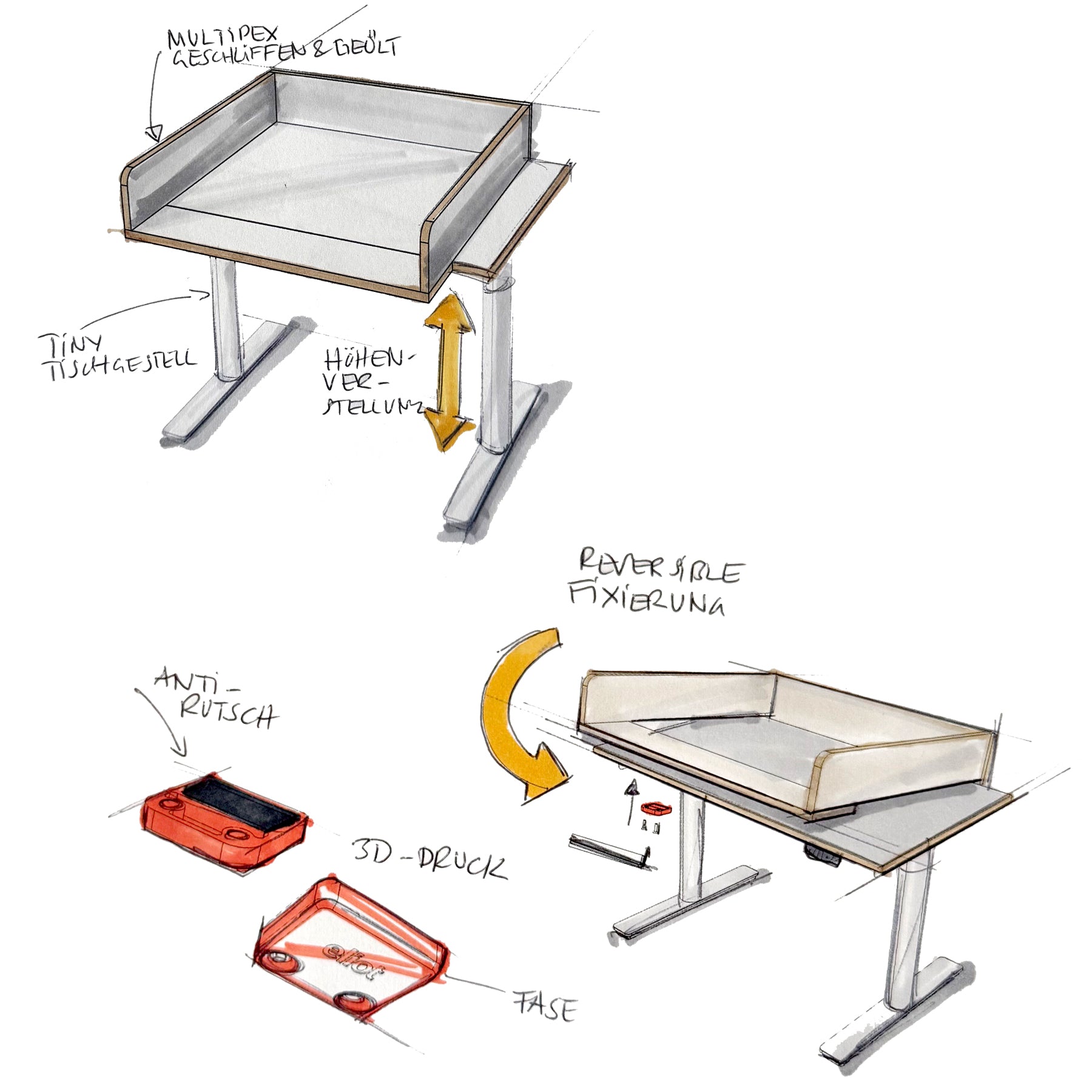 Dank der drei 3D-gedruckten Fixierblöcke lässt sich der Aufsatz sicher an der Tischplatte befestigen, ohne sie zu beschädigen. So bleibt der Tisch später uneingeschränkt als Kinder- oder Homeoffice-Schreibtisch nutzbar.