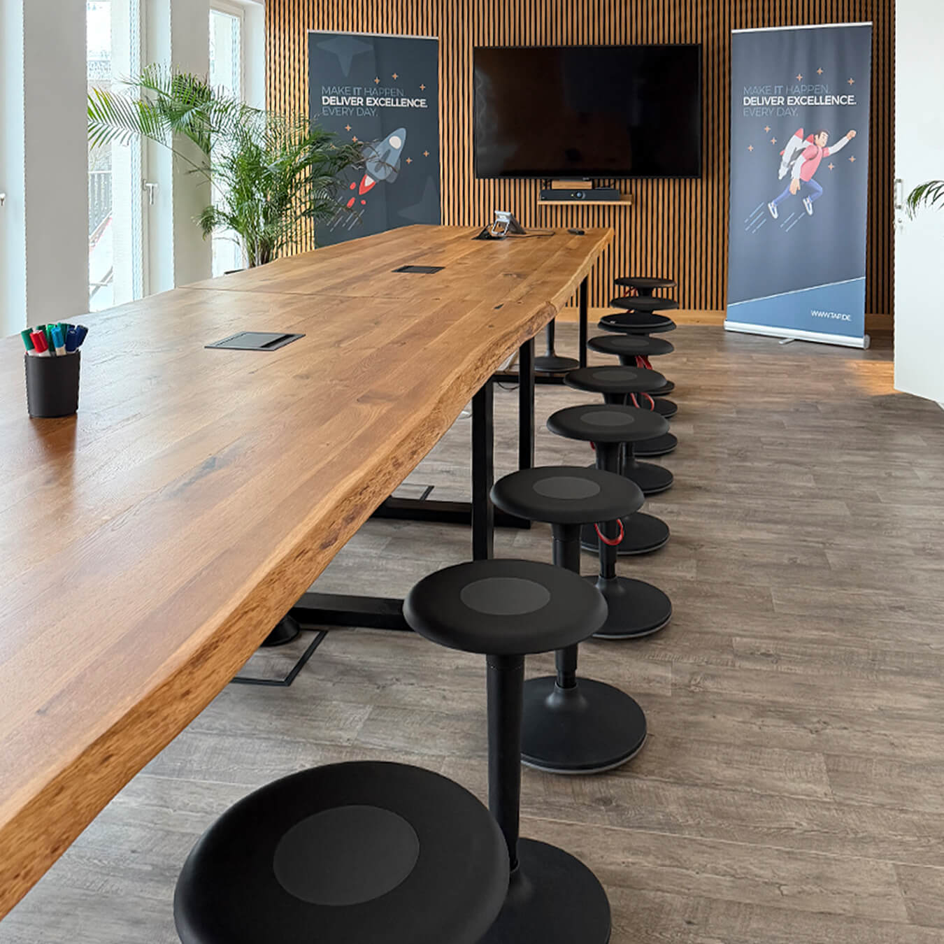 | Vorteile | Freude und Wohlbefinden durch aktivierten Stoffwechsel und mehr Energie. Muskulatur im Rücken und Rumpf während des Sitzens kräftigen und unangenehme Verspannungen vorbeugen. Fokussiertere Konzentration, da Bewegung die Atmung und Sauerstoffzufuhr verbessert und so den Kreislauf aktiviert. |